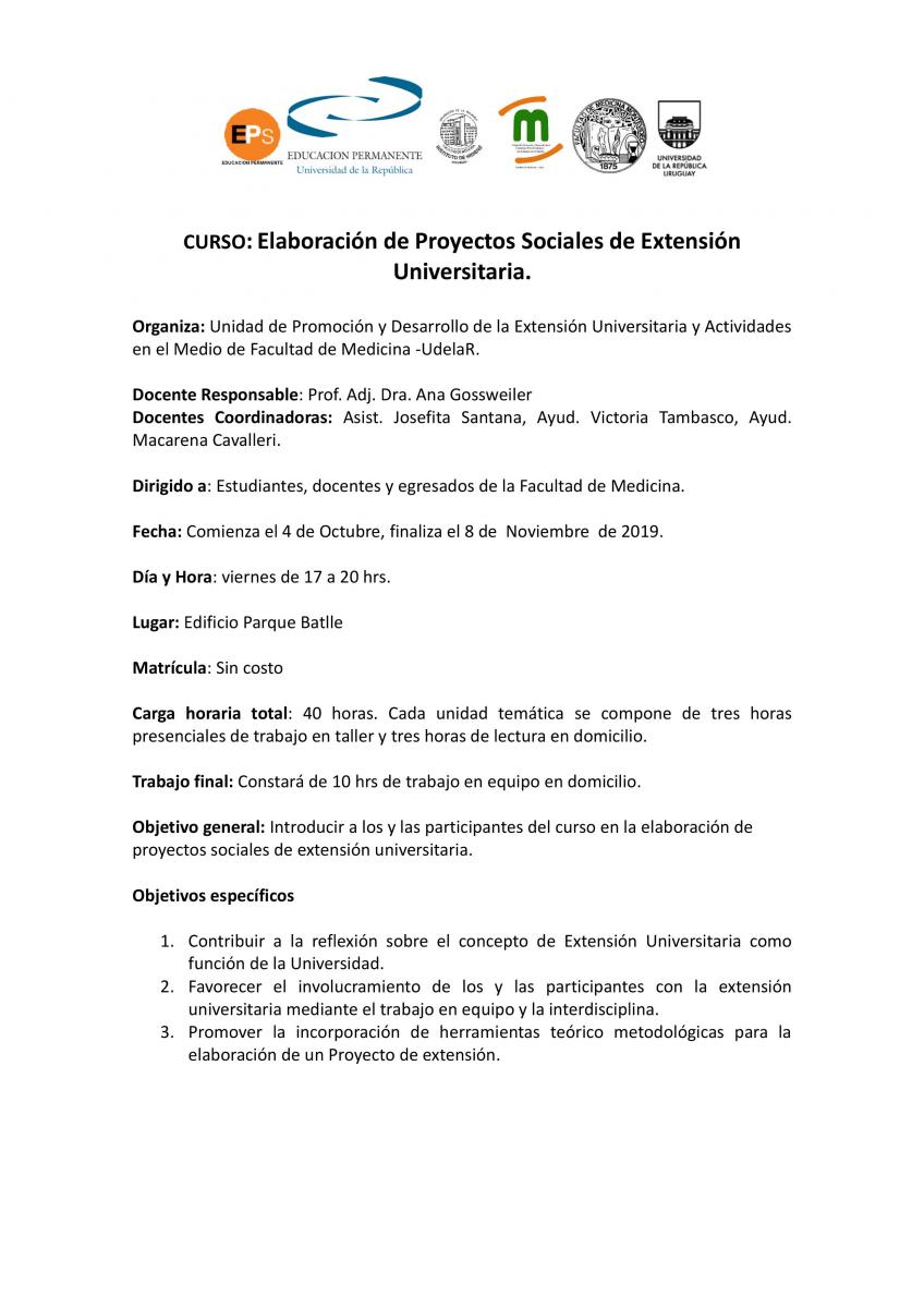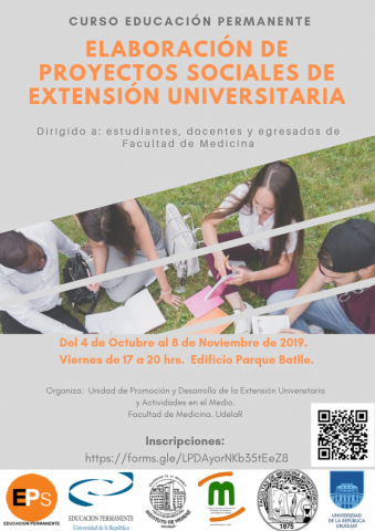 El 4 de octubre comenzará el curso de Educación Permanente: Elaboración de Proyectos Sociales de Extensión Universitaria organizado por la Unidad de Promoción y Desarrollo de la Extensión Universitaria y Actividades en el Medio de Facultad de Medicina.