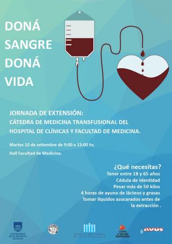 El próximo martes 10 de setiembre de 9 a 15 hrs se realizará en el Hall de Facultad de Medicina una nueva Jornada de Donación de Sangre, organizada por la Cátedra de Medicina Transfusional del Hospital de Clínicas.